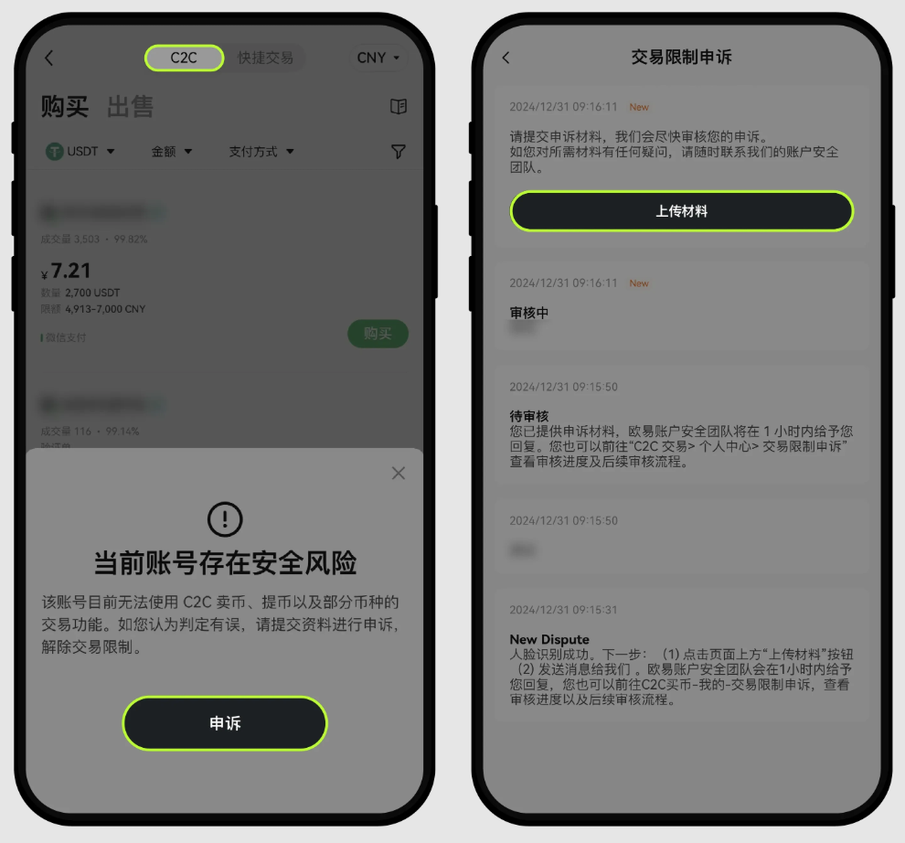 触发风控请您不要担心,可以点击 App 首页- C2C 买币,根据页面下方跳出的弹窗提示点击申诉按钮进行申诉。
